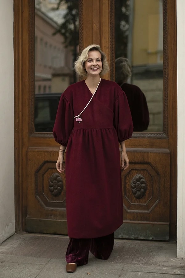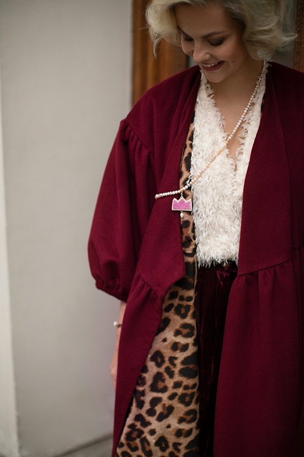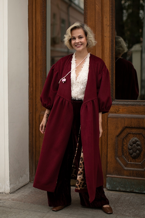 Perhaps our coat made of gray textured wool will become the outerwear that will replace the boring classic coat in your wardrobe. Flowing, romantic and... practical! You can put it on a dress when leaving the theater, and be elegant and feminine, you can wear it with jeans and a T-shirt, and the usual image will change beyond recognition, or you can just wrap yourself up beautifully in it, sitting on the veranda of a cafe.. The lining is made of leopard crepe satin. And if you put on a headdress, cover your neck with a scarf or snood and add long gloves, you can wear it up to minus 5C.